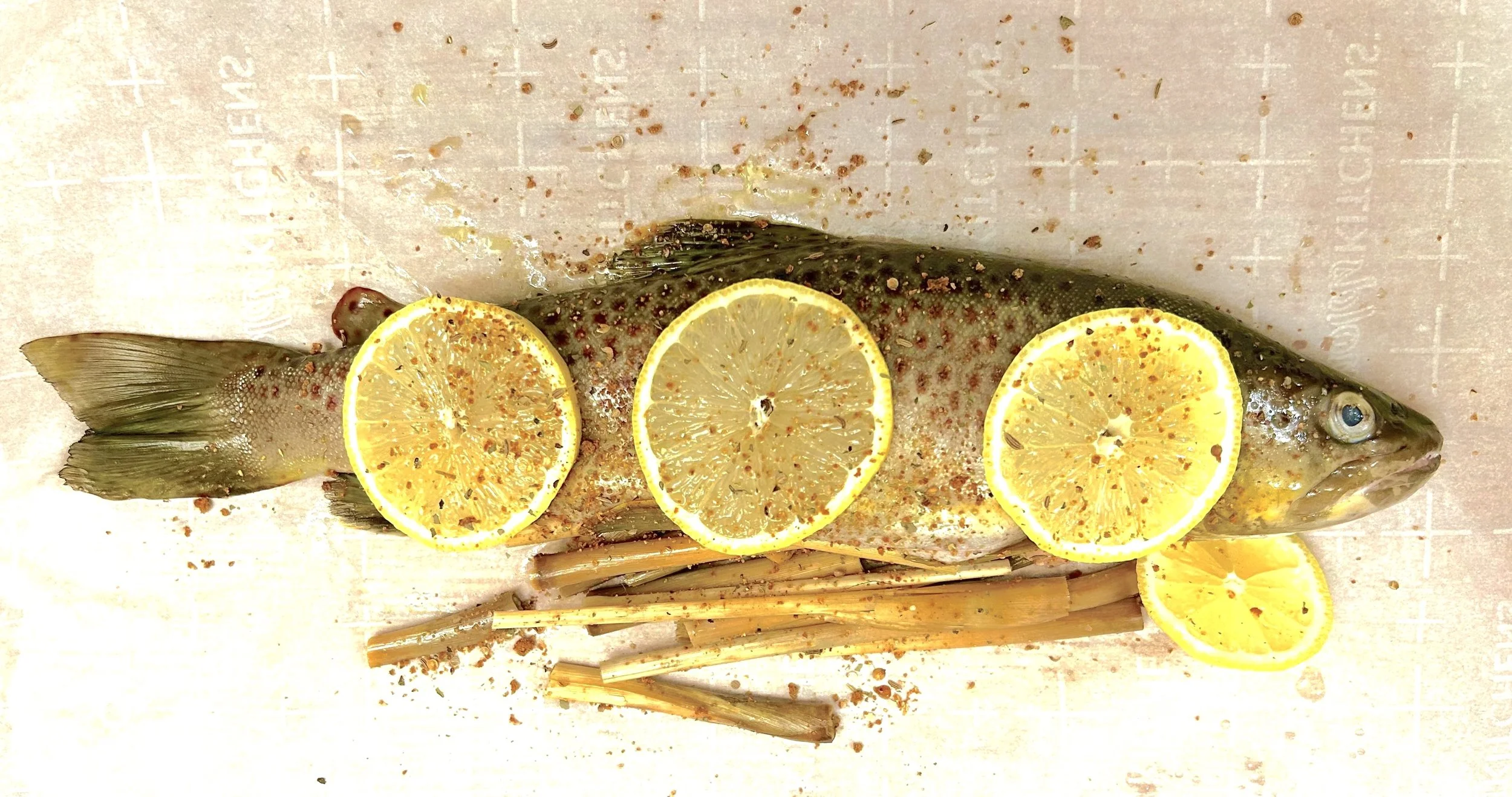 After filling the big trout with shafts of lemongrass, I laid it on parchment paper with a bit of my nephew’s olive oil, put some lemon slices and a sprinkling of this across the top, and the package was ready to crimp closed and bake at 400°F for 30 minutes.